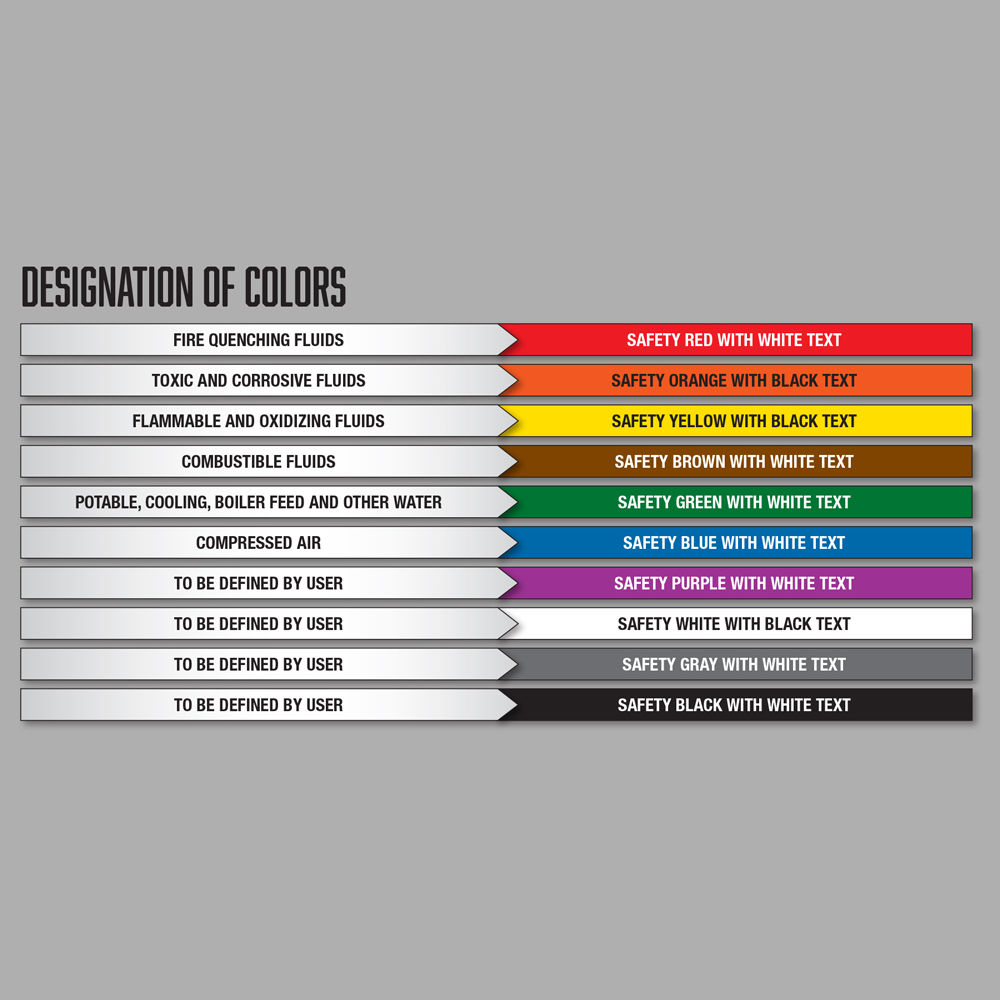 Directional flow arrow tapes are separate adhesive tapes or included on the pipe marker itself. They are used to indicate which way the substance inside the pipe is flowing, which is a required part of the ANSI standard. These arrows are essential for maintenance and emergency lockout/tagout procedures.