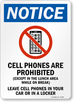 Use this Cell phones Prohibited Sign to inform your staff, visitors or students to leave their mobiles in car or in a locker and use it only on break in the lunch room.