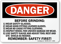 Grinders in construction zones can be dangerous, and sometimes people need to be reminded that safety comes first. Use this danger sign to make sure others remember to check that they are wearing safety glasses, leather gloves, no loose fitting clothing, and follow other crucial steps before grinding.