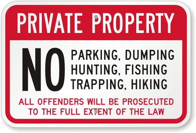Private Property Sign: No Parking, Hunting, Trapping, Dumping, Fishing, Hiking. Offenders Will Be Prosecuted K-7482