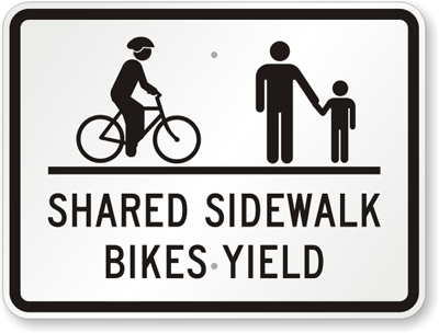 Remind cyclists to yield to pedestrians on sidewalk with our Shared Sidewalk Bikes Yield Sign. This sign prevents accidents at sidewalk that is shared by pedestrians, bikers, skaters etc. Note, our cyclist is wearing a helmet & you should too!