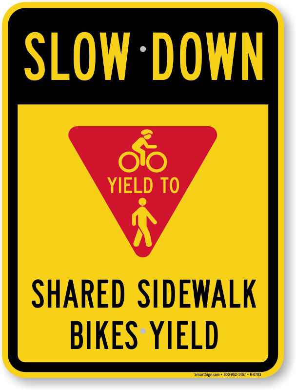 Slow Down Bike Sign: Shared Sidewalk Bikes Yield (Cyclists & Pedestrian Symbol) K-0703 Learn More...