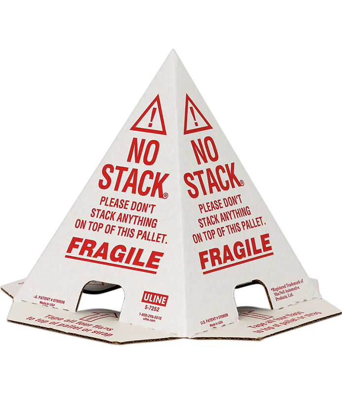 Our Stop Stack Pallet Cone prevents stacking on your fragile item package. Made of cardboard, the cone has No Stack and Fragile written on each side and features four flaps at the bottom. You may either tape it down on your package or put a strap through the flaps and secure the cone onto your fragile shipment.