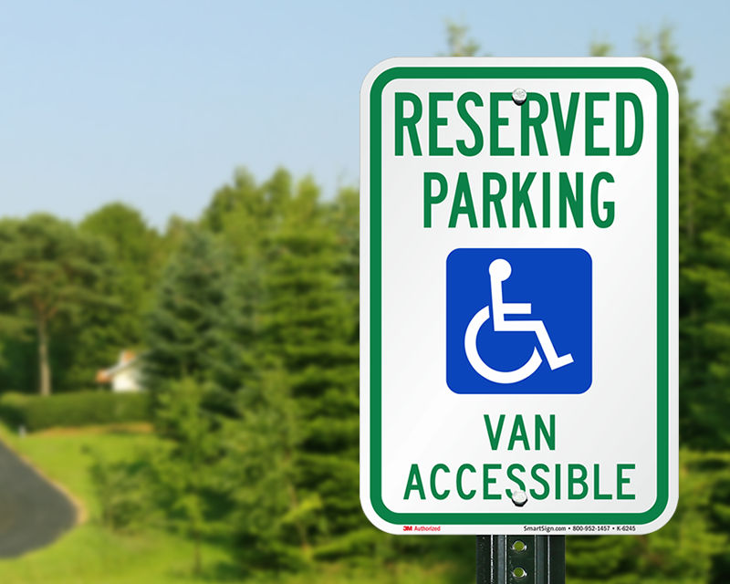 A van-accessible space requires an access aisle at least 8 feet wide, marked with a "van accessible" sign. At least one in every six accessible spaces must be van-accessible.