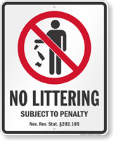 Nevada No Littering Sign: Subject To Penalty, Nev. Rev. Stat. §202.185 K2-0062-NV Learn More...